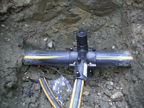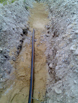 Cijev se vodi po rovu, dubine oko 70 cm. Nakon iskopa rova, na dno se postavlja pijesak koji čini "posteljicu" na koju se postavlja radna cijev. Nakon toga se cijev zatrpava sa 10-15 cm pijeska kako bi se zaštitila od mogućih budućih oštećenja uslijed vibracija i teških tereta koji bi mogli prelaziti preko cijevi.
