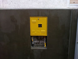 Završetak kućnog priključka u zgradi se može nalaziti u podrumu, ulazu ilistubištu, fasadnom ili nazidnom ormariću. Ako sepriključak nalazi u podrumu, posebnu pozornost trebaobratiti na prolaz kroz vanjski zid, što treba ostvariti kroz zaštitnu cijev (tzv. klasičnim načinom) ili u obliku kapsule, a zatim propisno zabrtviti.
